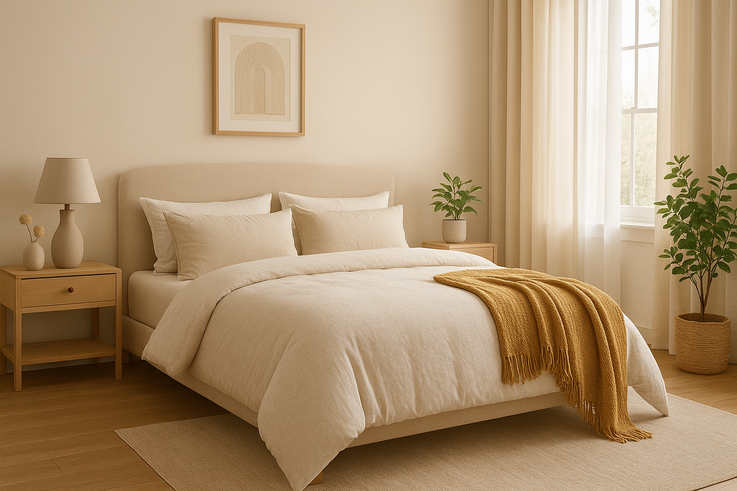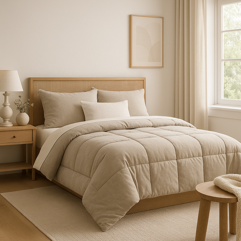 Cozy, modern comforters for warmth, softness, style. Neutral tones, premium materials for modern bedroom.